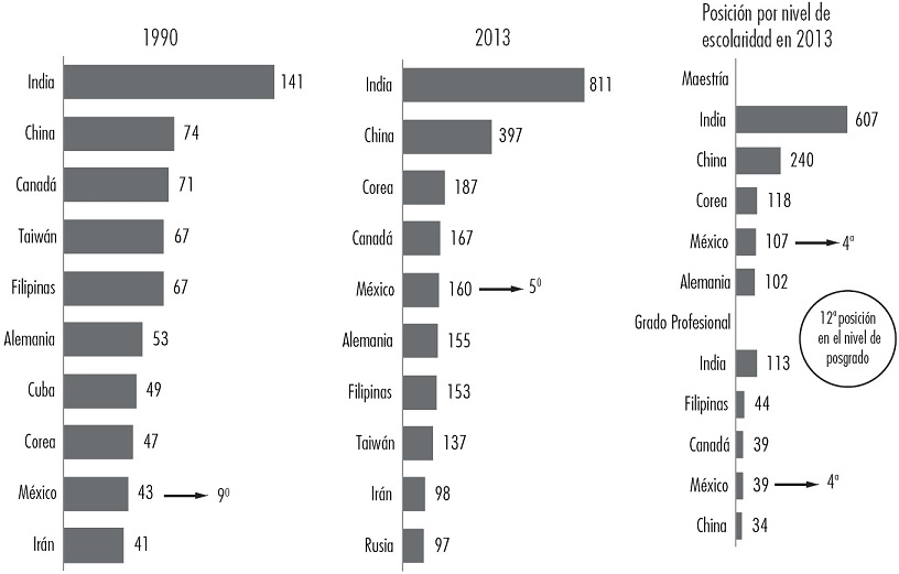 Los inmigrantes mexicanos con posgrado representan un factor clave en la dinámica económica de Estados Unidos. Con base en el censo 1990 y la encuesta de población ACS 2013 de Estados Unidos se identifica la importante posición de los mexicanos respecto de otros grupos de inmigrantes ACA. En 1990, la inmigración mexicana con posgrado ocupaba la novena posición con 43 mil personas, siendo India y China los países con el mayor número de connacionales con posgrado en ese país. Desde el año 2000 hasta 2013 se ha mantenido en la quinta posición, le anteceden en orden de importancia India, China, Corea y Canadá (véase gráfica 2). La dualidad del dinamismo migratorio mexicano observado (baja calificación y alta calificación) confirma la vinculación e importancia de la migración mexicana en ese país.
