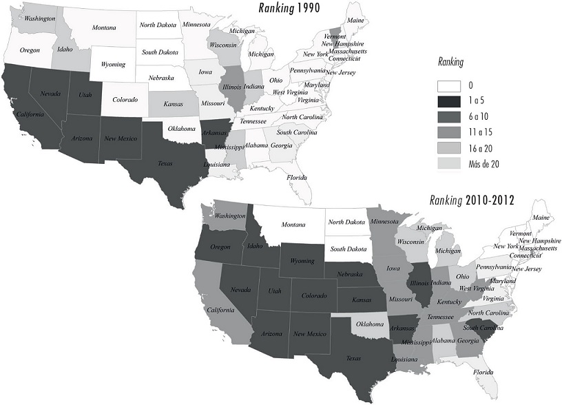 La heterogeneidad de los lugares de destino y asentamiento de los inmigrantes mexicanos CA es uno de los elementos que caracterizan los patrones actuales de esta migración en Estados Unidos (Gaspar, 2015). En el mapa 2 se consigna la presencia de mexicanos con posgrado en prácticamente todo el territorio norteamericano y la importancia que tiene esta inmigración en cada estado. Con datos de la ACS se verifica que en 14 estados ocupan las primeras cinco posiciones con el mayor número de inmigrantes ACA: California, Texas, Arizona e Illinois, estados en donde no sólo hay una mayor presencia de mexicanos con posgrado, sino que además observaron el mayor crecimiento entre los años 2000 y 2010-2012.