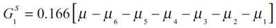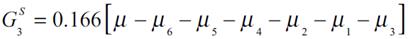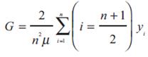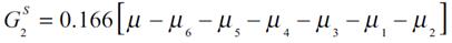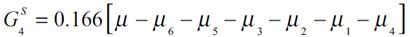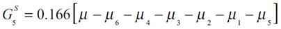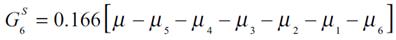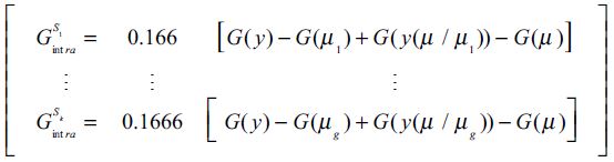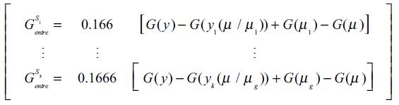 (5f)Las ecuaciones previas, conforman la población con medias de salario [μ1, K, μ6] que aíslan el efecto medio del ingreso μ y del resto de medias en cada subgrupo asignando el peso correspondiente. Así la descomposición se representa con dos componentes entre e intra, Gk que es equivalente al cálculo del índice de Gini de las ecuaciones expresadas en (5a) a (5f) con la siguiente fórmula: