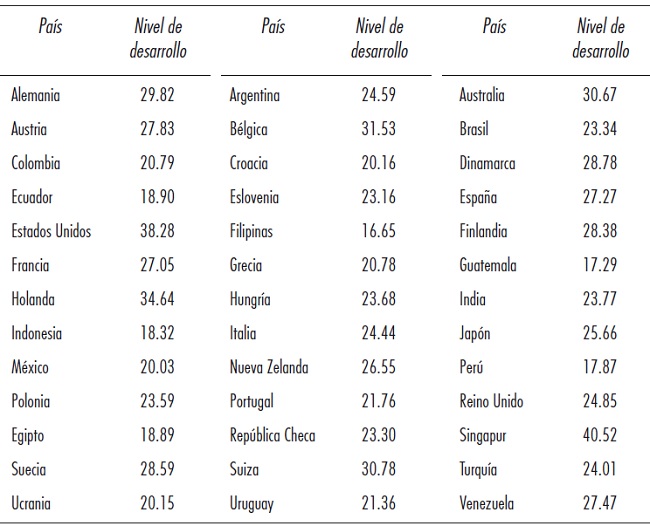 En este contexto, las demás variables que conforman el indicador de nivel de desarrollo representan un conjunto de indicadores que abarcan dimensiones tanto económicas, sociales, como medioambientales. Así, el PIB es el resultado de la producción anual con valor añadido; cuando se incluye el cálculo per cápita, es una base para comparar los niveles de desarrollo nacional y para calcular un conjunto de índices que caracterizan a los vectores de desarrollo socioeconómico de cada uno de los países (Novichkov, 2007). Por otra parte, Tridico (2007) encontró que invertir en el desarrollo humano es crucial para obtener un crecimiento en el PIB, sin embargo, dado que el desarrollo humano está correlacionado con las instituciones, una política institucional adecuada es importante para que se dé un proceso de desarrollo.