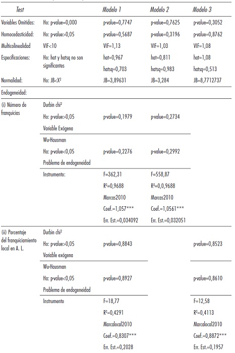 Por otra parte, la relación causa-efecto establecida en hipótesis, intuitivamente y basada en la matriz de correlación (véase Cuadro 2), podría ser inversa. Aunque no existe literatura al respecto, se prueba si existe un posible problema de endogeneidad en la estimación econométrica, es decir, que no sean las franquicias las que determinan el desarrollo del país, sino el desarrollo del país el que determina la situación de las franquicias. Sobre la base de lo antes planteado, se compara un modelo estimado mediante mínimos cuadrados ordinarios y uno en dos etapas, donde se instrumentó la variable, con su pasado. Asimismo, y con base a la matriz de correlación se realiza la prueba para la variable. Esta prueba se realizó para los tres modelos. En los dos primeros modelos se realizó la prueba de endogeneidad para la variable Marcas, mientras que para los Modelos 1 y 3, se efectuó para la variable Marcas locales. El resultado muestra que se acepta la hipótesis nula, y las variables son exógenas (véase cuadro 2). En síntesis, aunque intuitivamente se puede hablar de la existencia de relación de causalidad inversa (problemas de endogeneidad), después de realizar la prueba, se puede asegurar que no hay problemas de este tipo. Por lo tanto, la relación propuesta entre las variables es la adecuada, al basarnos en literatura empírica para establecer esta relación, la especificación del modelo es la adecuada.