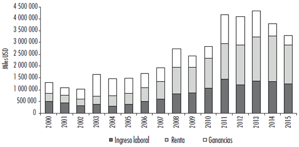 La evolución de la distribución entre ingreso laboral y plusvalor (renta más ganancias) muestra dos momentos diferenciados. De 2000 a 2004 el plusvalor crece en términos relativos y absolutos, al tiempo que el ingreso laboral sigue el proceso inverso. El primero pasa de 61 a 80.5% del VAB y en términos absolutos crece de 790 a 1.182 millones de dólares, mientras que el ingreso laboral cae de 39 a 20% del VAB y se reduce de 506 a 287 millones de dólares. Por el contrario, en el periodo 2005-2015 se recupera en términos absolutos y relativos el ingreso laboral, mientras cae en términos relativos el plusvalor pero se incrementa significativamente en cifras absolutas. El ingreso laboral se recupera en el periodo pasando de 20% a un máximo de 38% del VAB en 2015, mientras que en cifras absolutas crece de 381 a 1.250 millones de dólares. Por su parte, el plusvalor cae en términos relativos, oscilando entre 73% (2005) y 62% del VAB (2015), pero crece en términos absolutos de 1.093 a 2.040 millones de dólares, con un pico máximo de 2.965 millones de dólares en 2013.