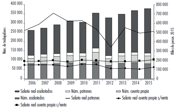 En segundo lugar, desde 2003 se inicia una etapa fuertemente expansiva en el valor apropiado por el sector que modifica la participación relativa de las fuentes de remuneración. El boom de los commodities permite expandir la participación relativa del ingreso laboral que se expresa en un significativo incremento del valor de la fuerza de trabajo en la medida que la masa de ingreso laboral creció por la expansión en los ingresos reales de los asalariados entre 2006 y 2015 más que por la cantidad de ocupados que tiende a mantenerse estable (véase gráfica 2). En el caso de las otras clases (cuenta propia y patrones), es destacable que, como tendencia, se mantiene el número de ocupados al igual que los asalariados, pero a diferencia de éstos su ingreso real no registra incrementos significativos, en tanto entre los años de 2006 y 2015 el salario patronal real cae un 1.7% mientras que en el caso de los cuenta propia sube un 9.6%, pero si se quita la renta, su remuneración real cae un 16.1%, siendo la clase que registra menores ingresos lo que podría estar explicando su proceso e proletarización, en tanto entre los años 2000 y 2011 los establecimientos de tipo familiar (con la definición oficial) se redujeron de 32.696 a 25.580 (Tommasino et al., 2014).
