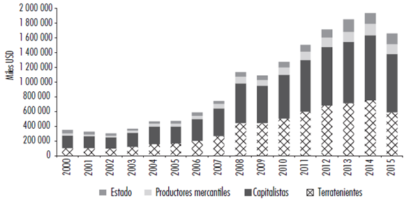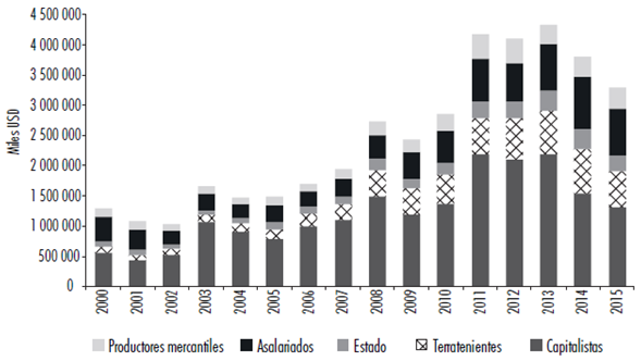 Cuando el foco se pone en la distribución social del VAB agropecuario entre las clases sociales que participan del proceso productivo y el Estado que apropia plusvalor para reproducir las condiciones generales de acumulación se observan tendencias congruentes con las analizadas en el apartado anterior (véase gráfica 3). En los años de crisis (2000-2003) se reduce la participación de los asalariados en el producto de 31 a 17%, se mantiene la participación relativa del Estado y los terratenientes (en el entorno de 8-9% del VAB), y crece de forma significativa la participación de los capitalistas en el producto de 43 a 64%, lo que expresa el proceso de reestablecimiento de las condiciones de la acumulación a expensas del valor de la fuerza de trabajo. De 2004 a 2013 se registra un significativo incremento del VAB total que se tradujo en un incremento absoluto del valor apropiado por todos los sujetos, y que en términos relativos muestra como principal transformación un avance de los terratenientes a costa de los capitalistas en tanto los primeros pasan de apropiar 8 a 16% del VAB, mientras que los segundos reducen su participación de 61 a 50%. En esos años la participación del Estado se mantiene en el entorno del 7%, la de los asalariados oscila entre 15 y 18% y la de los productores mercantiles oscila entre 7 y 10%. Finalmente, 2014 y 2015 muestran el agotamiento del ciclo expansivo de los commodities afectando la participación en el producto de los capitalistas a costa del crecimiento de la participación de los asalariados que llegan a 24% del VAB en 2015.