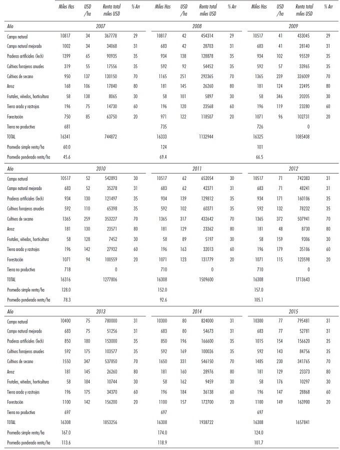 Para el cálculo de la renta del suelo por hectárea se partió de los datos de precio de arrendamiento que publica desde 2007 la DIEA a partir del procesamiento de los datos de arrendamientos registrados en la Dirección General de Registros del Ministerio de Educación y Cultura, lo que prácticamente representa el 100% de los contratos de arrendamiento formal. Las cifras publicadas establecen el precio de arrendamiento a nivel nacional, así como discriminan los precios por destino productivo. A partir de este desglose por rubro se reconstruyó la renta del suelo ponderada para la totalidad de la superficie productiva a partir de las cifras de uso del suelo con base en los Censos Generales Agropecuarios (DIEA), las encuestas por rubro de la DIEA y las declaraciones juradas a Dirección y Control de Semovientes (DICOSE). Este ajuste es importante ya que el promedio nacional esconde el problema de que las magnitudes de superficie arrendadas anualmente por rubro no equivalen al uso del suelo en la totalidad de la superficie productiva, en tanto hay rubros como la agricultura donde alrededor del 70% de la superficie está bajo arrendamiento, mientras que en la ganadería el porcentaje baja a un 30%. En el anexo 1 se presenta el detalle de superficie ocupada, precio de arrendamiento, renta total y porcentaje arrendado según uso del suelo.