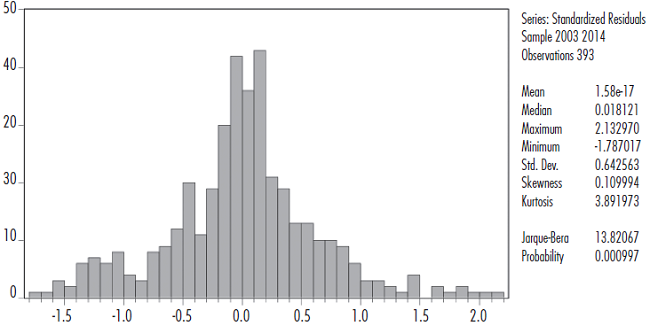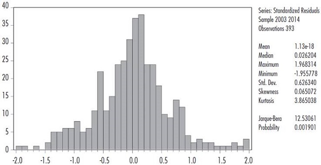 Los residuos del primer modelo están distribuidos de manera normal, con una media muy cercana a cero, una asimetría también muy cercana a cero (0.10) y una curtosis con un valor muy cercano a tres, ello a pesar de que el valor de la probabilidad del estadístico Jaruque-Bera es menor a 0.05 (es decir, según este estadístico no se debe aceptar la hipótesis nula de que los errores se distribuyen de manera normal, a un nivel de confianza del 95%) (véase gráfica 2).