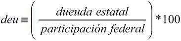 El modelo de transparencia y deuda pública estatal considera el logaritmo del saldo de la deuda pública estatal en proporción a los ingresos percibidos por los estados por concepto de participaciones federales, como función de la transparencia que se define como variable dummy, y se expresa en términos logarítmicos: