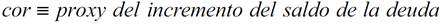 El segundo modelo considera la misma variable endógena en logaritmos del modelo 1, representada por el saldo de deuda pública estatal como proporción de los ingresos estatales por concepto de participaciones federales, como una función del incremento del saldo de la deuda medida a través de una proxy sobre los límites de endeudamiento estatal (1 cuando existen límites normativos y 0 con no existen).