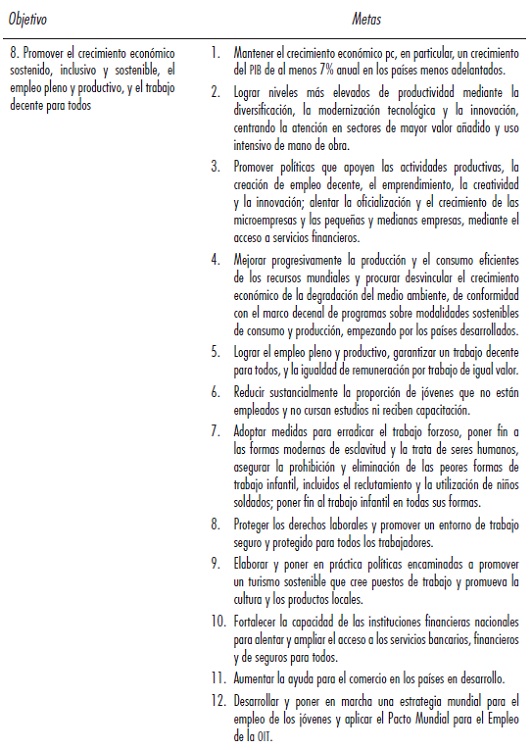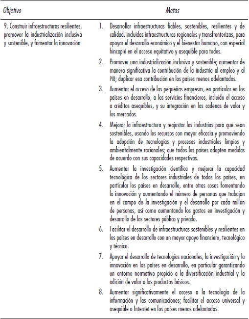 Los dos objetivos y sus 20 metas se definen como la agenda económica de los ODS en la discusión subsecuente de este trabajo. En su contenido detallado los objetivos 8 y 9 están orientados a alcanzar crecimiento sostenido, industrialización, pleno empleo y trabajo decente. Las metas establecen medios y acciones principalmente dirigidas a la diversificación productiva, la modernización tecnológica y la innovación; el fortalecimiento y acceso financiero en especial para atender a pequeñas y medianas empresas; el desarrollo de infraestructuras, gasto en investigación y desarrollo, tecnologías de la información; y las políticas de trabajo decente, racionalización de los recursos y sostenibilidad ambiental.