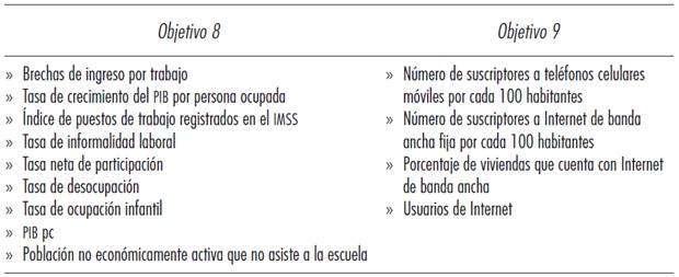 El gobierno mexicano junto con el Programa de las Naciones Unidas para el Desarrollo y la Agencia Mexicana de Cooperación Internacional para el Desarrollo lanzaron una plataforma piloto donde publica su propuesta de indicadores para el monitoreo de los objetivos y metas de la Agenda 2030. El cuadro 2 muestra la propuesta de indicadores del gobierno mexicano correspondientes a los objetivos 8 y 9.