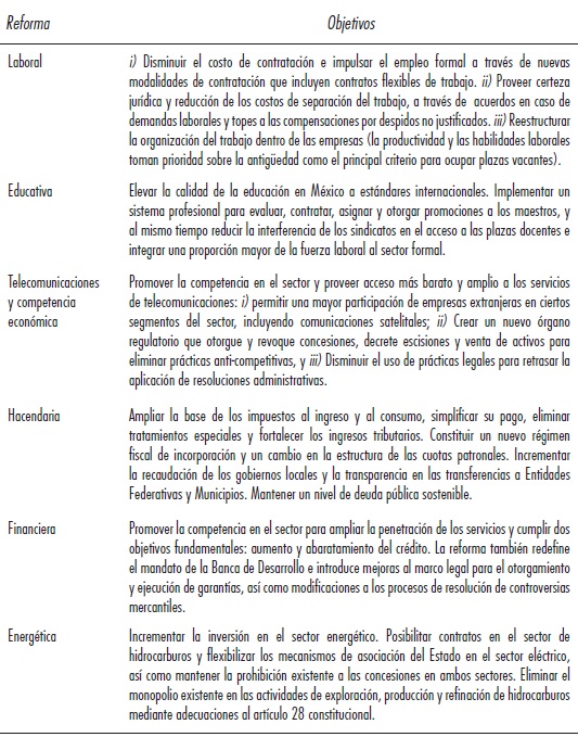 En concordancia con estos factores se han formulado varias de las reformas estructurales de la historia mexicana reciente. Entre ellas, las más trascendente en materia de desarrollo económico, se encuentran la reforma laboral, la educativa, la de telecomunicaciones y competencia económica, la hacendaria, la financiera, y la energética. Estas reforzaron el espíritu aperturista y privatizador de la política económica conforme al precepto de alcanzar la eficiencia en los mercados. La compatibilidad de esta orientación reformista (véase cuadro 3) con las políticas nacionales necesarias para alcanzar las metas de la agenda internacional de desarrollo es una cuestión a evaluar.