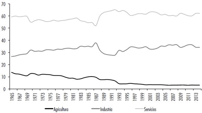 En los años sesenta, el sector industrial sobrepasó la participación de la agricultura en el valor agregado nacional total (véase gráfica 1). En 1965 la agricultura representó menos del 14% del valor añadido y la industria (incluyendo a la minería) casi 27%. En los años posteriores se observa la participación decreciente de la agricultura y avances relativos de la industria, si bien a partir de 1988 la economía mexicana muestra una estructura fuertemente orientada a los servicios (incluyendo al comercio y el transporte).