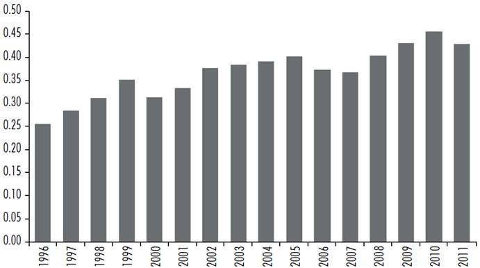 En referencia al cambio sectorial de la economía mexicana, las cifras del Banco Mundial señalan que entre 1988 y 2011 el empleo industrial como porcentaje del empleo total alcanzó en promedio alrededor de 25% y no presentó variaciones importantes a través del periodo (véase gráfica 7). Anteriormente se ha señalado que la economía mexicana se ha orientado mayormente a los servicios y el comercio, sectores que se han caracterizado por su baja productividad y tecnología.