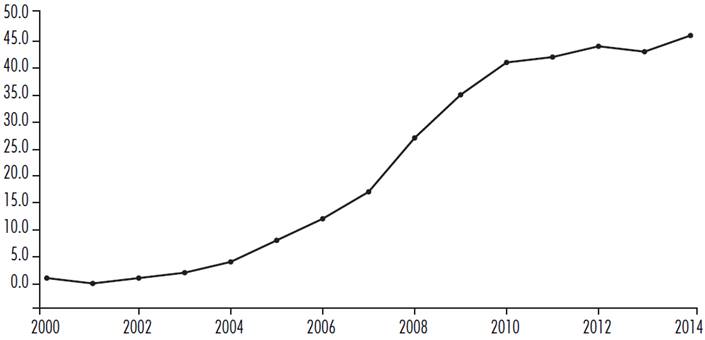 En cuestión de infraestructura el indicador que se propone en la plataforma mexicana es el porcentaje de viviendas con conexión de banda ancha. La figura 4 muestra el acelerado crecimiento en este indicador, presentando un porcentaje casi nulo en 2000 y rebasando 45% en 2014, aunque permanecen rezagos en la cobertura.