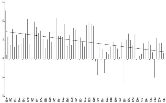 Por su parte, el PIB per cápita decreció en términos reales 1.8% promedio anual durante el periodo 1982-1987, y entre 1982 y 2013 creció anualmente 0.48%, en contraste con el 3.29% anual experimentado de 1940 a 1981 (véase gráfica 3).