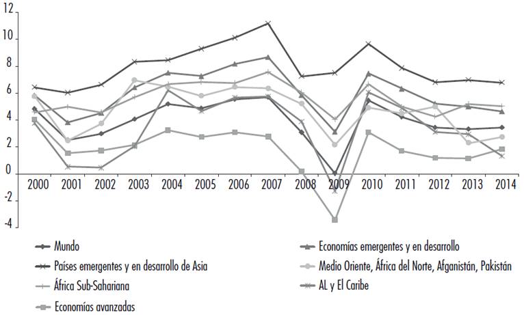 En la agenda de desarrollo internacional 2015, la erradicación de la pobreza se ubicó de forma explícita como el principal de los desafíos de la comunidad internacional. Pero un renovado interés y preocupación por el crecimiento productivo tanto de países en desarrollo como de naciones desarrolladas cobró fuerza a raíz de las crisis financieras y económicas internacionales de 2008 y 2009 cuando se evidenció la significativa vulnerabilidad e inestabilidad económica de numerosos países como consecuencia de la profunda interconexión de las entidades económicas y financieras a nivel global. Fue entonces cuando se comenzaron a plantear posibles ajustes necesarios en los planos internacional, nacional y local. Cierto optimismo sobre el crecimiento económico mundial en los años previos a la crisis respondió a la presencia de tasas de crecimiento relativamente altas en distintos países en desarrollo, incluso africanos. De 2002 a 2007 se registró un incremento en el consumo en países desarrollados y un boom exportador y de inversión extranjera en países emergentes, liderados por China. Estas dinámicas fomentaron confianza y subestimaron los riesgos de mantener una economía global sustentada en elevados flujos de crédito (Verick e Islam, 2010). La gráfica 4 muestra la evolución del crecimiento económico mundial y de sus principales regiones a partir de 2000. En ella se observan tasas de crecimiento reducidas en los países desarrollados y la dificultad de recuperar los ritmos de crecimiento previos a 2007.