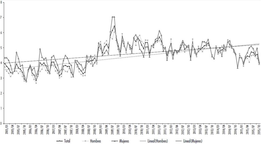 Para evaluar algunas dimensiones clave del mercado laboral mexicano se revisan los datos disponibles sobre las tasas de desocupación, las brechas de ingreso y la tasa de ocupación infantil. Las tasas de desocupación han permanecido relativamente bajas (oscilan en el 5%), indicando así que casi la totalidad de la población económicamente activa se encuentra empleada. Las tasas de desocupación más altas se observan en 2009, sin embargo, no alcanzan el 7%. En el caso de las mujeres hay una tendencia a experimentar tasas más elevadas (véase gráfica 6).