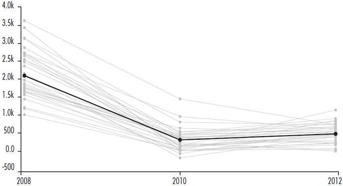 La brecha nacional de ingresos por trabajo, que se mide como la diferencia entre los ingresos laborales promedio entre los hombres y las mujeres, muestra una reducción entre 2008 y 2012 (véase figura 2). El sostenimiento de esta tendencia contribuirá de manera positiva a alcanzar metas específicas de la agenda económica y en materia de reducción de las desigualdades.