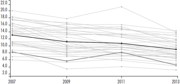 Según las cifras oficiales, la tasa promedio nacional de ocupación infantil se ha reducido de 13 a 9% entre 2007 y 2013 (véase figura 3). Se presentan diferencias considerables entre los estados de la República mexicana, siendo Guerrero la entidad con las tasas más altas. La tendencia decreciente de este indicador representaría otro signo alentador en materia del cumplimiento de los ODS.