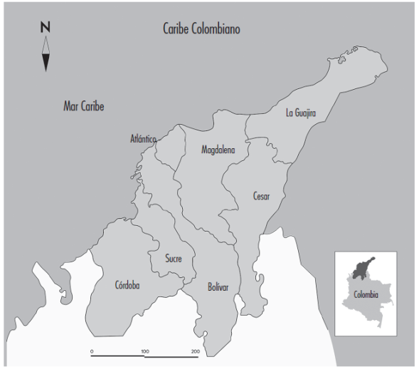 Este territorio extendido (véase Figura 1) puede ser caracterizado como un proceso continuo de transición de la premodernidad hacia la modernidad, donde las principales características de la vida urbana pueden ser observadas en la mayoría de las capitales de las provincias, pero donde estos núcleos urbanos están rodeados por pequeños pueblos rurales donde la premodernidad prevalece. El desarrollo capitalista de Colombia ha sido muy desigual desde el punto de vista regional, generando algunos puntos focales de modernidad en varios núcleos urbanos los cuales mantienen lazos con áreas retrazadas donde la agricultura y la ganadería no están desarrolladas de una forma moderna. Por tal razón, la base productiva es muy heterogénea, con actividades industriales en algunas ciudades como Barranquilla, Cartagena y Santas Marta, combinadas con la minería moderna en el norte de la Guajira, con una mezcla de modernas y premodernas actividades de agricultura y ganadería.