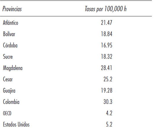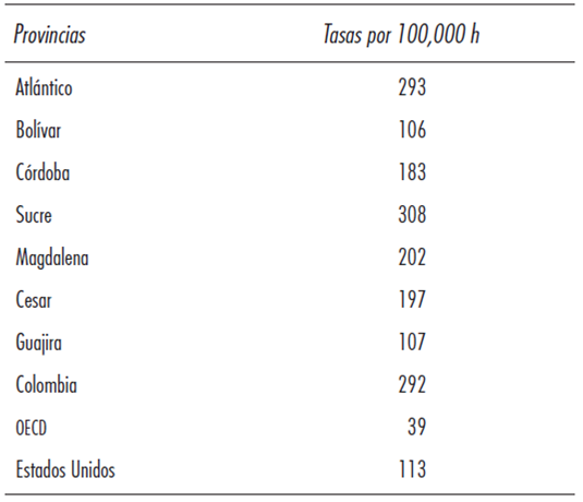 En el cuadro 1, las tasas de homicidios de la región son muy altas comparadas con las registradas en naciones desarrolladas, pero no tan malas comparadas con las promedio de Colombia, una nación afectada por la violencia política y el tráfico de drogas. Sin embargo, esta realidad afecta las actividades normales de personas, gobierno y negocios. La frontera con Venezuela se ha venido deteriorando últimamente, afectando la situación de Cesar y La Guajira. El cuadro 2 muestra las tasas de robo mismas que son muy altas comparadas con naciones desarrolladas y se han venido deteriorando durante los últimos años, a pesar de las mejoras en las tasas de homicidio. La situación se ha visto incrementada en forma preocupante en las principales ciudades de la región, aunque el problema se ha ido expandiendo a los pueblos menores en áreas rurales. El microtráfico de drogas y el resurgimiento de grupos neo-paramiliatares parece estar jugando un rol representativo. Este ambiente institucional introduce altos costos de transacción para los negocios, personas y aún para el gobierno, en sus actividades diarias, para garantizar alguna seguridad en sus transacciones.