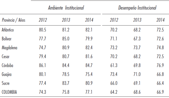 Un factor importante en el desempeño institucional de un territorio es la percepción de los empleados públicos sobre su gobierno, en relación al ambiente institucional (credibilidad de las reglas, procedimientos y certidumbre de los recursos fiscales). En relación con el desempeño institucional (capacidad del sector público, rendición de cuentas y bienestar de los empleados públicos es un importante elemento de la moral del sector público. El Departamento Nacional de Estadística (DANE) recoge esta información a través de una encuesta nacional (véase cuadro 3) donde algunas mejoras en ambas variables se pueden observar a nivel nacional. Sin embargo, a nivel provincial, no hay una clara tendencia, observándose algunas mejoras en Atlántico, Magdalena, Cesar y Sucre. Aparentemente la mayoría de las provincias registran con resultados superiores a la media nacional, lo cual es positivo (DANE, 2015).