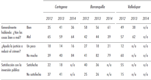 Con respecto a las percepciones ciudadanas sobre las ciudades de las cuales podemos tener alguna información, suministrada por encuestas (véase cuadro 4), solamente en Barranquilla podemos observar alguna mejora en la percepción ciudadana de cómo van las cosas, pero es claro que la percepción sobre el sistema judicial en la capacidad de combatir el crimen es muy baja. En forma similar, la opinión pública acerca de la satisfacción con la inversión pública local es muy baja (Barranquilla Cómo Vamos, 2012-2014).