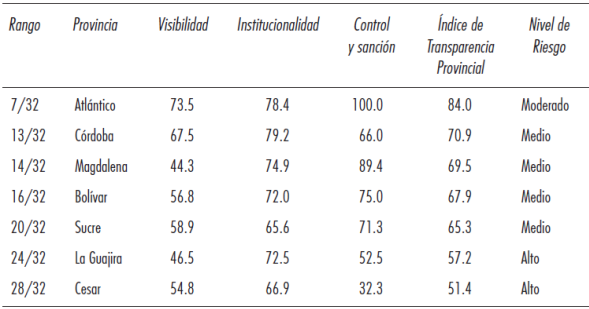 En el cuadro 5, el Índice de Transparencia puede observarse para las provincias de esta región. El índice está compuesto por tres elementos: 1) Visibilidad (midiendo la rendición de cuentas, e-gobierno, información pública abierta); 2) Calidad institucional (se refiere a la calidad de los procesos contractuales, y gerencia de la planeación); 3) Control y sanción (proceso de auditoría y seguimiento al gasto público e información a los ciudadanos). Puede observarse que sólo Atlántico se posiciona satisfactoriamente, mientras Córdoba, Magdalena y Bolívar están en la mitad, pero tenemos situaciones de riesgo en La Guajira, Cesar y Sucre.