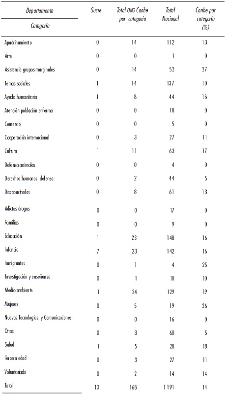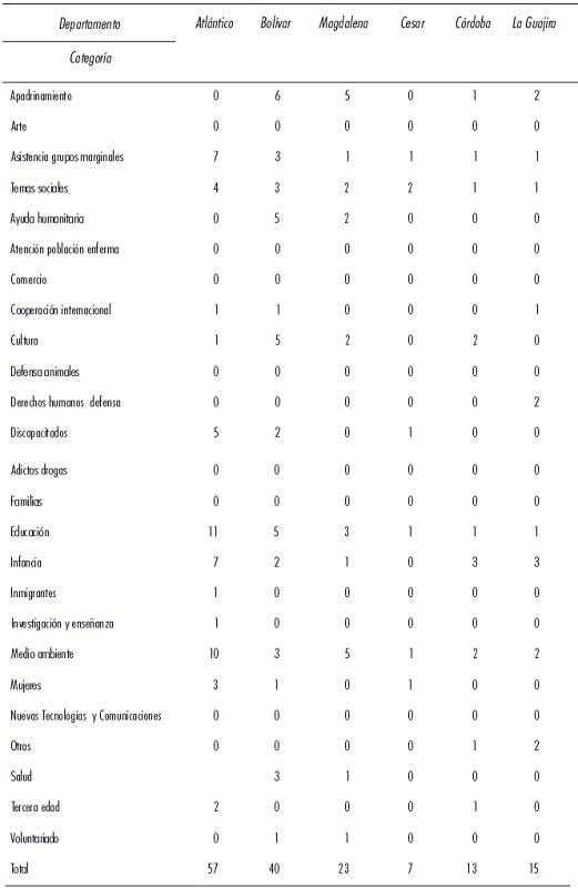 En el cuadro 6 podemos observar que el mayor número de ONG en el Caribe están orientadas a gente marginal, ayuda humanitaria, educación y salud. Se puede destacar cierto activismo en campos como inmigrantes, ambiente y mujeres. Temas relacionados con la democracia, transparencia y rendición de cuentas de finanzas públicas no son las áreas más preferidas. La razón de ello es que la mayoría de estas ONG están buscando capturar recursos públicos para desarrollar sus programas sociales, y los gobiernos locales y provinciales las usan para ejecutar sus programas, usualmente ligadas a grupos políticos específicos que controlan la política local. Finalmente, Atlántico tiene el mayor número de ONG en la medida en que es el más poblado (ONG.info.com, 2015).