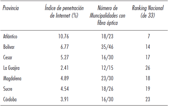 En resumen, las condiciones previas para estas provincias para convertirse en “inteligentes” son muy problemáticas en relación con la densidad de la sociedad civil, participación política, grado de apertura del sector público a los medios y ciudadanos, el control político de partidos políticos que no son progresivos, y la debilidad de la infraestructura digital, con la excepción de los teléfonos celulares, donde la cobertura excede la población. Uno puede visionar ciertas posibilidades en Barranquilla y Cartagena, pero será más difícil para el resto de las provincias ponerse al frente de ello, por la ausencia de un desarrollo material adecuado y las limitaciones digitales del área. Las posibilidades de desarrollar un amplio rango de innovaciones están restringidas por la debilidad de la sociedad civil, las bases materiales y productivas, y la infraestructura económica y digital. Muchas veces las políticas sociales a favor de los pobres terminan en casos de corrupción, aunque se ha registrado un gran progreso en la cobertura de la población en los servicios de educación y salud. El “Internet de las Cosas” está más limitado a los celulares y, en menor escala, a tabletas y computadores. Transformar estas áreas urbanas en territorios “inteligentes” será una tarea difícil debido a que las principales precondiciones definidas con anterioridad no son garantizadas.
