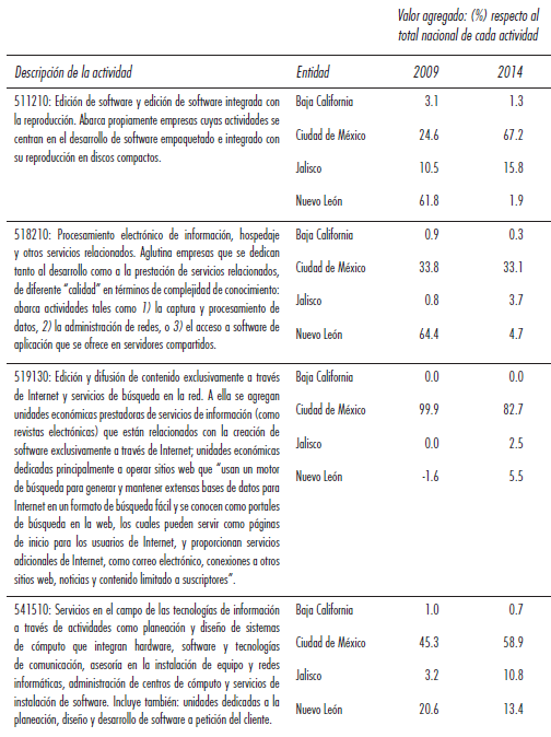 Se advierte que en cada uno de los cuatro subsectores de la industria del software, la participación de la Ciudad de México es mayoritaria a nivel nacional. Para el año de 2014 tiene un rango de participación nacional en la generación de valor agregado que va desde 33.1%, correspondiente al subsector 518210, hasta 82.7% en el subsector 519130. En el mismo año, la participación de Jalisco oscila entre 2.5% (subsector 519130) y 15.8% (511210). La participación de Nuevo León tiene valores entre 1.9% (511210) y 13.4% (541510). Por su parte, Baja California presenta valores distantes y muy bajos respecto a los casos mencionados.