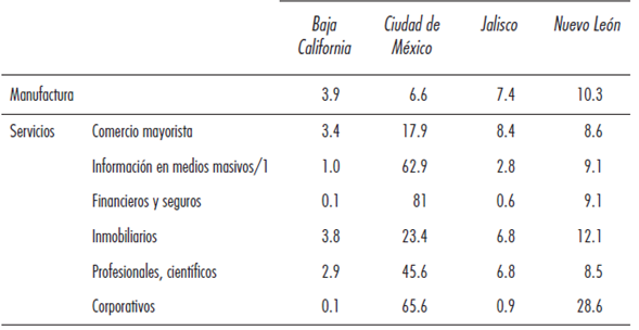 Como se observa la Ciudad de México tiene una participación superior a las de las otras entidades en cada uno de los servicios, no así en manufactura.