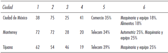 Los datos arrojan perfiles claramente diferenciados: las empresas de la Ciudad de México tienen clientes con los que la duración del vínculo es menor que en el caso de las otras ciudades y, en cambio, el peso de clientes del sector público y de los servicios es más importante. En Monterrey, el sector privado es más importante que el público pero, como en la Ciudad de México, también se enfoca mayoritariamente a servicios. La ciudad de Tijuana se caracteriza por un mercado en que predomina el sector privado, así como por el equilibrio entre servicios y manufactura.