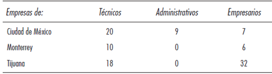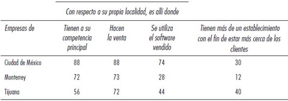 Puede verse que, para las empresas de software, Tijuana es una ciudad atractiva para empresarios externos a la localidad en una proporción alrededor de cinco veces superior a la de las otras dos ciudades. Por su cuenta, las empresas de software de Ciudad de México y Tijuana atraen de otras ciudades al doble de empleados técnicos con respecto a Monterrey. En otros términos, en Monterrey es acusada la característica de que las empresas de software usan recursos humanos formados localmente.