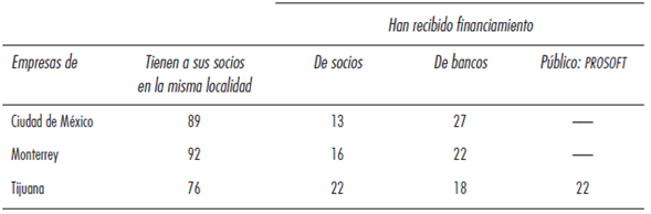 Es de destacar que sólo en Tijuana las empresas consignan financiamiento proveniente de la Secretaría de Economía por la vía del programa público PROSOFT. Del mismo modo, Tijuana se diferencia por el hecho de consignar el menor grado de “propiedad local”, respecto a las otras dos ciudades. En la Ciudad de México, las empresas acuden más al financiamiento bancario.