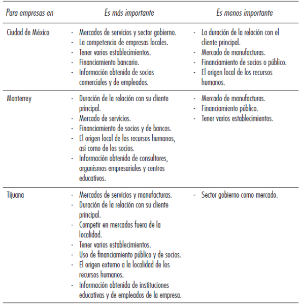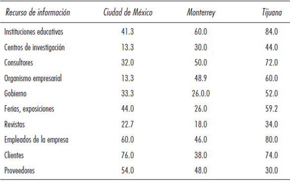 En términos generales, en la Ciudad de México es el propio mercado (el eje cliente-empresa-proveedor) el sector de información más importante; en las otras ciudades, particularmente en Tijuana, hay un uso más amplio del sistema regional (tómese en cuenta que con excepción de clientes y proveedores, en el resto de fuentes de información se observa una tasa de respuesta más alta que en las otras dos ciudades).
