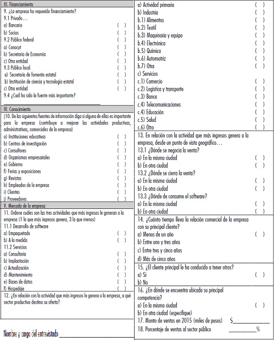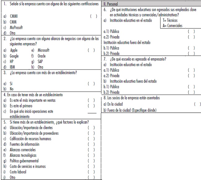 Se puede considerar éste como un método aplicable al estudio de empresas de software con una perspectiva de mercado local y para su replicabilidad (en el Anexo del artículo se reproduce la encuesta utilizada). Importantes regiones que han mostrado dinamismo en esta industria son las localizadas en la misma Gudalajara, dentro del estado de Jalisco, o en las zonas metropolitanas del Estado de México, Puebla, Guanajuato, Zacatecas, entre otras, y este instrumento puede ser empleado para generar mayor conocimiento sobre el desarrollo local de la industria de software, desde la perspectiva que se ofrece en este trabajo.