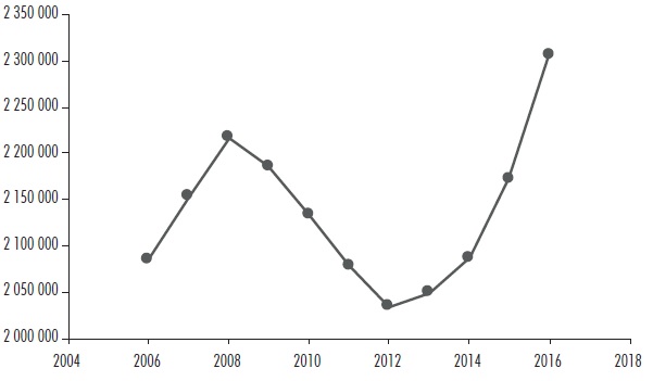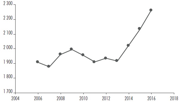 De acuerdo con los datos del Ministerio de Justicia de Japón, los residentes de origen mexicano registran una tendencia al alza desde el año 2014, y se ubica en 2 262 personas en 2016. Las cifras no se incluyen a los diplomáticos ni a los mexicanos bajo el estatus de corta permanencia, sólo se contabilizan a los residentes de mediana y larga estancia (véase Gráfica 2).