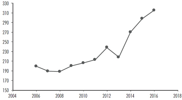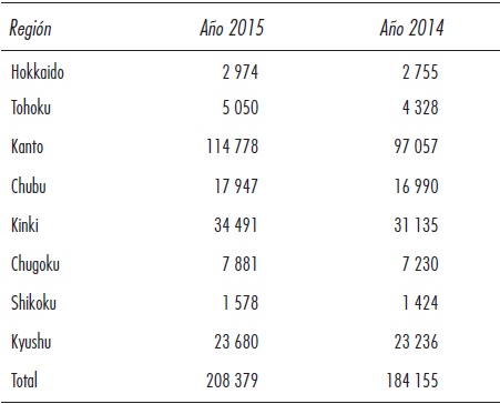 Se ha afirmado que el flujo de capital japonés y la relocalización de la producción de las firmas multinacionales crean oportunidades de empleo para los trabajadores nativos locales, y da a ellos el acceso a recursos y conexiones necesarias para migrar a Japón (Sassen, 1991, p. 32). A pesar de que en Japón no se tiene una cultura política y una formación de identidad que incorpore a la inmigración (Sassen, 2014, p. 200), este país atrae trabajadores internacionales de diversos países. La presencia y tendencia de extranjeros en Japón cada año crece (véase Gráfica 1). En 2016, el Ministerio de Justica de Japón reportaba 2 307 388 extranjeros, se observa pues que la migración de la población de Asia es primordial y contribuye con el 82.5% de los extranjeros en Japón. Destacan los países de China, Corea y Filipinas. En el caso del continente americano participa con el 13.2% de extranjeros, las principales naciones del flujo migratorio a Japón son Brasil, Estados Unidos y Perú. Europa aporta el 3.3% y los principales países que contribuyen al flujo migratorio son Reino Unido y Francia.