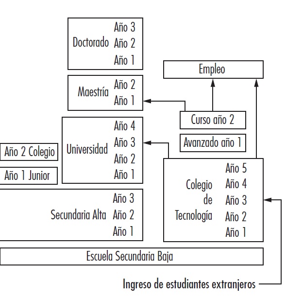 Quizás el primer eslabón, en la migración de recursos humanos calificados, es cursar los estudios en el sistema educativo japonés, el cual consta de diversos niveles y categorías: secundaria alta, colegios de tecnología, colegios junior, universidades, maestría y doctorado, como se muestra en la Figura 1. El Ministerio de Educación, Cultura, Deporte, Ciencia y Tecnología (MEXT) se encargó de realizar las encuestas sobre el sistema educativo japonés hasta 2003. Después esa función la adquiere Japan Student Services Organization, (JASSO) establecida en el año de 2004.