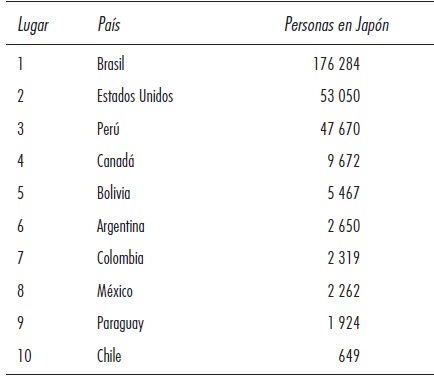 De manera particular, se observa que en el año de 2016 residían 304 865 personas en Japón, provenientes del continente americano. De ellos, el 99% tenía su origen en 10 países diferentes. Como se aprecia en el Cuadro 1, la presencia de brasileños en Japón es notable. Brasil marca la tendencia principal del flujo migratorio de América a Japón debido a la presencia de población nikkei en Brasil; en tanto, los mexicanos ocupan la posición número ocho.