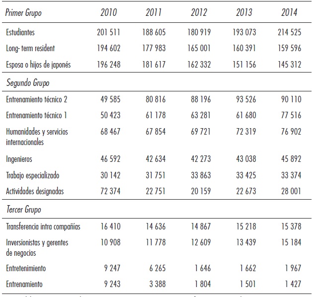 El segundo grupo está integrado por los migrantes educativos temporales bajo la forma de capacitación para el trabajo. Este flujo responde a la presencia de inversiones japonesas en el mundo y a la capacitación de los empleos de las empresas multinacionales. Finalmente, en el tercer grupo se hallan la transferencia de trabajadores de las empresas multinacionales con sede en Japón. En conjunto, es claro el flujo de inmigrante en Japón, especialmente son estudiantes y trabajadores especializados.