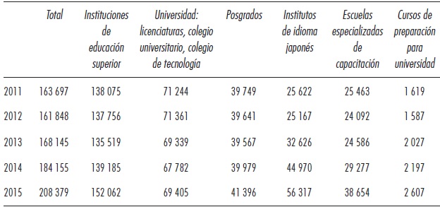 El Ministerio de Justicia reporta un incremento importante en el número de estudiantes internacionales en los diversos niveles de estudio. El número de estudiantes extranjeros en Japón ascendió a 257 739 en 2016; en 2015 se registraron 226 131; en 2014, 196 882; en 2013 a 178 551. El organismo público JASSO reporta, que en el año de 2015 había 152 mil estudiantes inscritos en instituciones de educación superior (IES) (véase Cuadro número 3). De ellos, 11 mil están inscritos en programas educacionales de corta duración, lo cual significa que están en programas de menos de seis meses con la condición de visa de College Student. El 55.8% de los estudiantes son hombres y el 44.2% son mujeres.