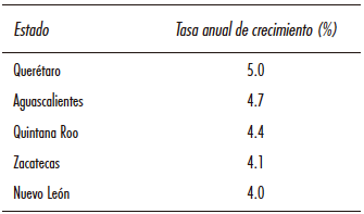En tercer lugar, los clústeres parecen ser otro de los aciertos de estos gobiernos subnacionales. Esto tiene resonancia con el reciente énfasis de la literatura respecto a la institucionalización de la cooperación público-privada para el desarrollo. Como lo postulan Hausman, Rodrik y Sabel (2008) y Schneider (2015), las instituciones de cooperación público-privada se han convertido en ejes centrales de recientes casos de éxito en desarrollo económico. Para los primeros autores, una “buena política industrial” es esencialmente el conjunto de “adecuaciones y prácticas institucionales que organicen esta colaboración (público-privada) de manera efectiva” (Hausman et al., 2008, p. 4). El acierto de este modelo de cooperación público-privada se reflejó en las tasas de crecimiento de los casos de estudio durante la década de 2005 a 2014, donde Querétaro quedó en primer lugar y Nuevo León en quinto, con tasas de 5 y 4%, respectivamente (Márquez, 2015). Se reflejó, asimismo, en los mayores índices de remuneración laboral a nivel nacional, con Querétaro en el tercer lugar y Nuevo León en el cuarto, detrás solamente de Ciudad de México y Campeche (Rosales, 2017).