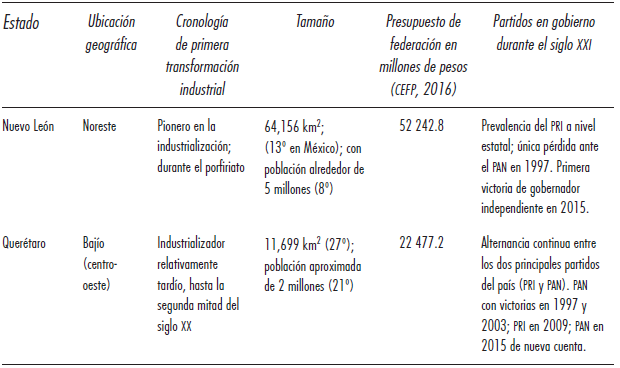 En claro contraste, Querétaro es uno de los estados mexicanos más pequeños. Ubicado en la zona del Bajío, es el vigésimo primero en cuanto a población y el vigésimo séptimo estado en términos de territorio. Durante la década de los cincuenta cuando Nuevo León ya era el líder industrial en México, Querétaro seguía siendo uno de los estados más pobres y marginados del país, con una perspectiva predominantemente rural. Sin embargo, Querétaro aparece en la actualidad, por lo general, entre los cinco primeros líderes respecto a la actividad industrial en México (INEGI, 2016; Márquez, 2015). Además, su primera transformación industrial se produjo durante el periodo conocido como el “milagro mexicano” (1940-1980), en un tiempo y contexto sustancialmente diferente al de la primera transformación industrial de Nuevo León.