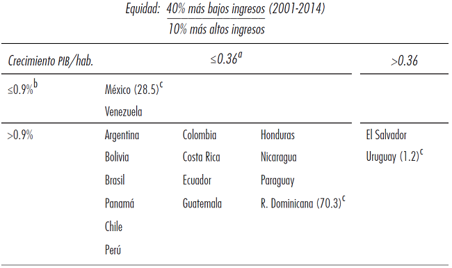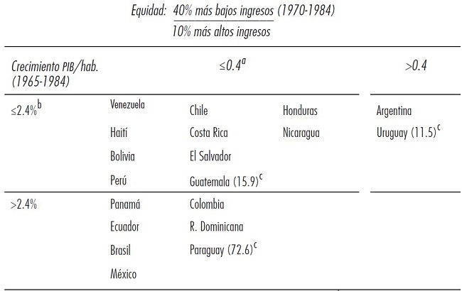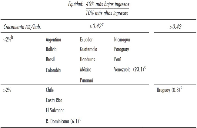 Para el periodo de 1985 a 2000, la relación de equidad de los países avanzados alcanzó un promedio de 0.84, de manera que la línea divisoria de equidad para América Latina se sitúa en 0.42. Una relación así, implica que el 40% de la población de ingresos más bajos posee un ingreso equivalente al 42% del ingreso del 10% de la población con mayores ingresos. Por su parte, el criterio de dinamismo económico revela un crecimiento per cápita del 2% promedio anual en los países avanzados. Al cruzar ambos criterios, se obtiene una matriz de cuatro casilleros.