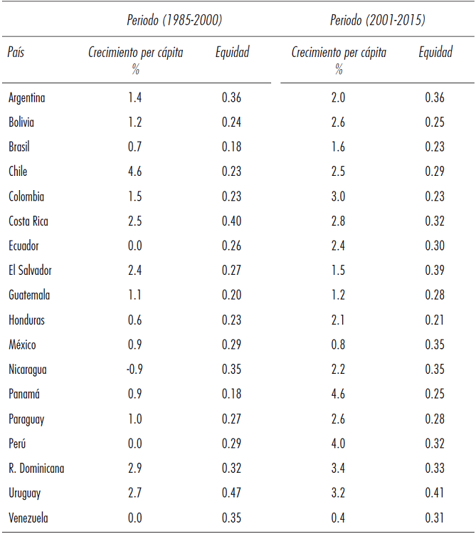 El periodo de estudio comprende desde 1985 hasta 2015, dividido a su vez en dos subperiodos (1985-2000 y 2001-2015). Siendo fiel a la metodología de Fajnzylber, se utilizan dos criterios para evaluar el desarrollo económico: el de equidad y el de crecimiento económico. El primero, consta de la relación de ingresos del 40% de la población más pobre y el 10% más rica, y el segundo se refiere la tasa media de crecimiento anual del producto interno bruto (PIB) per cápita. Se compara el desarrollo económico entre los países de América Latina tomando como referencia el desarrollo económico de los países avanzados (Alemania, Estados Unidos y Japón). La línea divisoria en el criterio de equidad para América Latina, es la mitad de la que se da en los países avanzados durante el periodo respectivo.