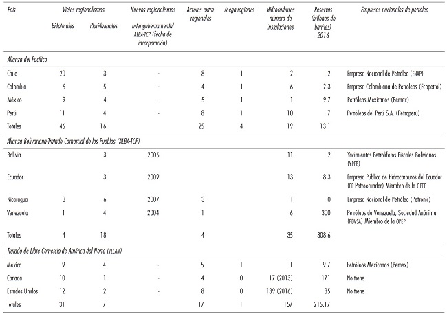 Los países miembros del TLCAN y de la Alianza del Pacífico siguen un modelo de regionalismo abierto que favorece el libre comercio, la inversión extranjera en muchas de las industrias, y el crecimiento basado en exportaciones, con fuertes alianzas con Estados Unidos. Los países miembros del ALBA-TCP persiguen un nuevo regionalismo estratégico (Aponte García, 2014, 2015) que rechaza el regionalismo abierto, que promueve políticas de soberanía petrolera, y que ha trabajado por el acercamiento con China. El viejo regionalismo predomina en la categoría de la Alianza del Pacífico, tanto con los acuerdos bilaterales como con los plurilaterales, en tanto, el nuevo regionalismo predomina en la categoría del ALBA-TCP.