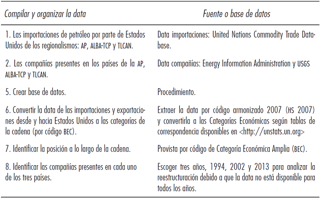 En esta investigación, Aponte García aplicó la metodología desarrollada anteriormente para clasificar y organizar los datos de las exportaciones de la Alianza del Pacífico y del ALBA-TCP hacia Estados Unidos de acuerdo al Código Tarifario Armonizado (Harmonized Tariff Schedule, HS, por sus siglas en inglés). El Cuadro 2 especifica los conceptos, los pasos utilizados en el método para compilar y organizar la data, y la fuente de la cual se obtuvieron los datos.