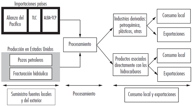 El Diagrama 1 ilustra la conceptualización de la cadena del petróleo, así como que el suministro proviene de las importaciones y de la producción en Estados Unidos. Entre los países a los que Estados Unidos importan petróleo encontramos la clasificación según el criterio de regionalismo: la Alianza del Pacífico, el ALBA-TCP y el TLCAN. Junto con la producción de los pozos petroleros localizados en Estados Unidos y el esquisto obtenido de la fracturación hidráulica, la nación norteamericana también obtienen la materia prima para el procesamiento en las refinerías. El procesamiento posterior abarca una serie de industrias, entre las que destacan las de productos directamente asociados con los hidrocarburos (como la gasolina) y las industrias de productos derivados como la de petroquímica y plásticos, entre otras. Los productos que generan estas industrias se canalizan hacia el consumo local y las exportaciones. En el presente trabajo analizaremos a detalle únicamente el rectángulo correspondiente a las importaciones de países de la Alianza del Pacífico, el TLCAN y el ALBA-TCP.